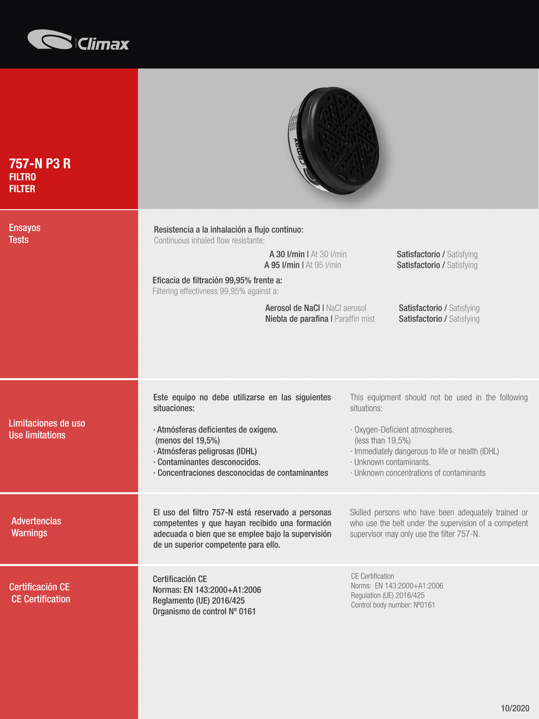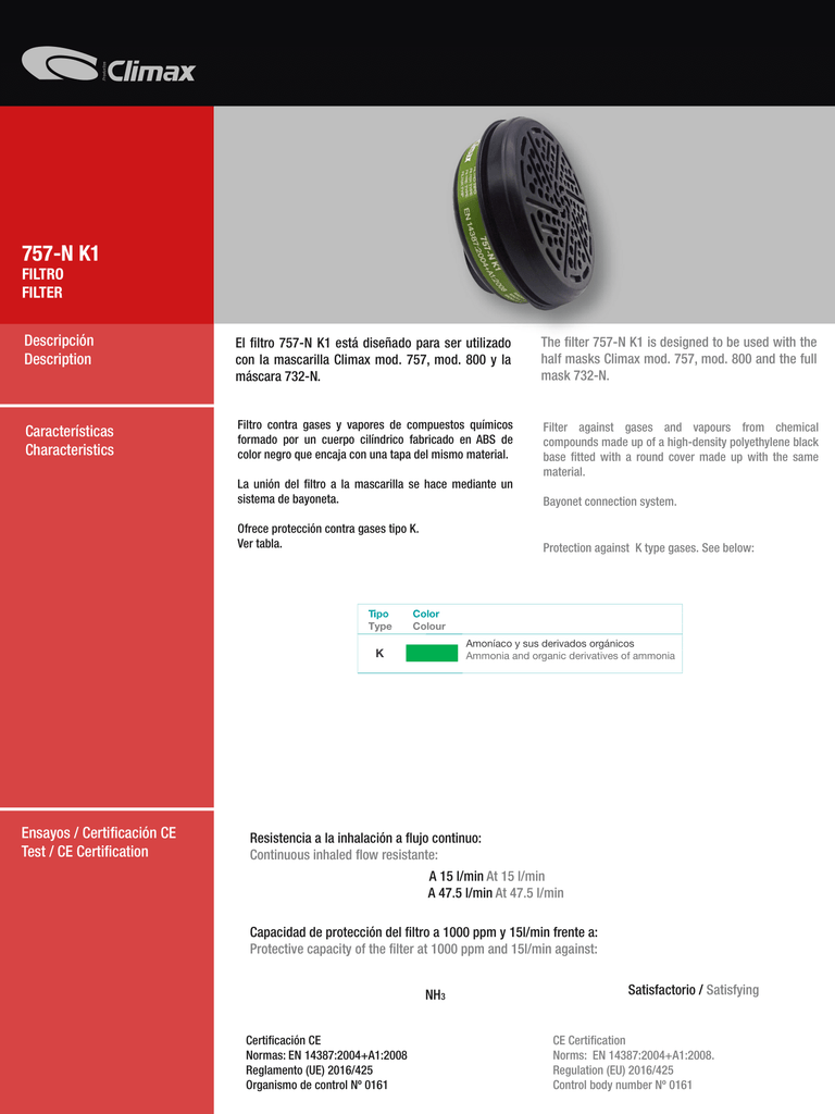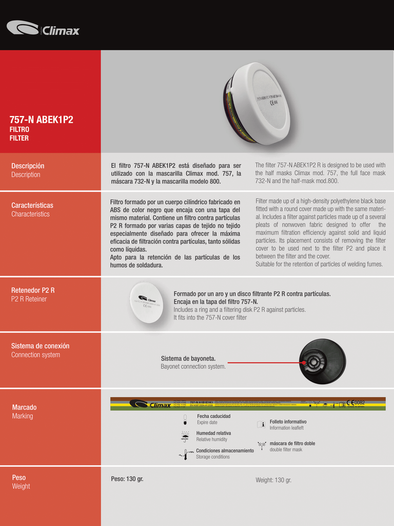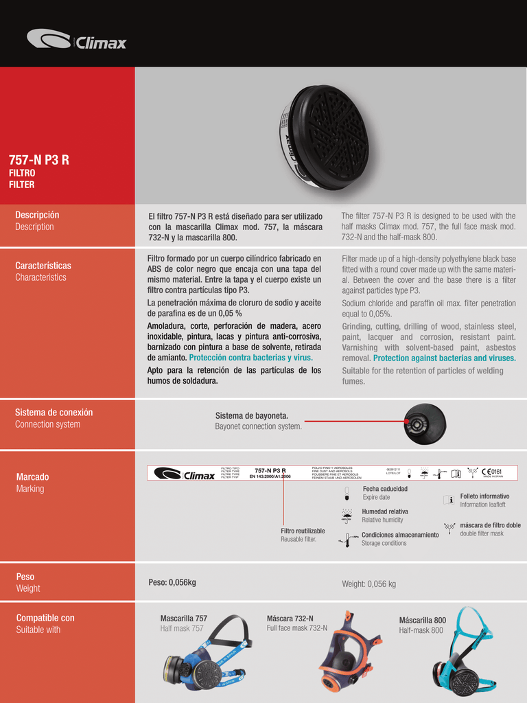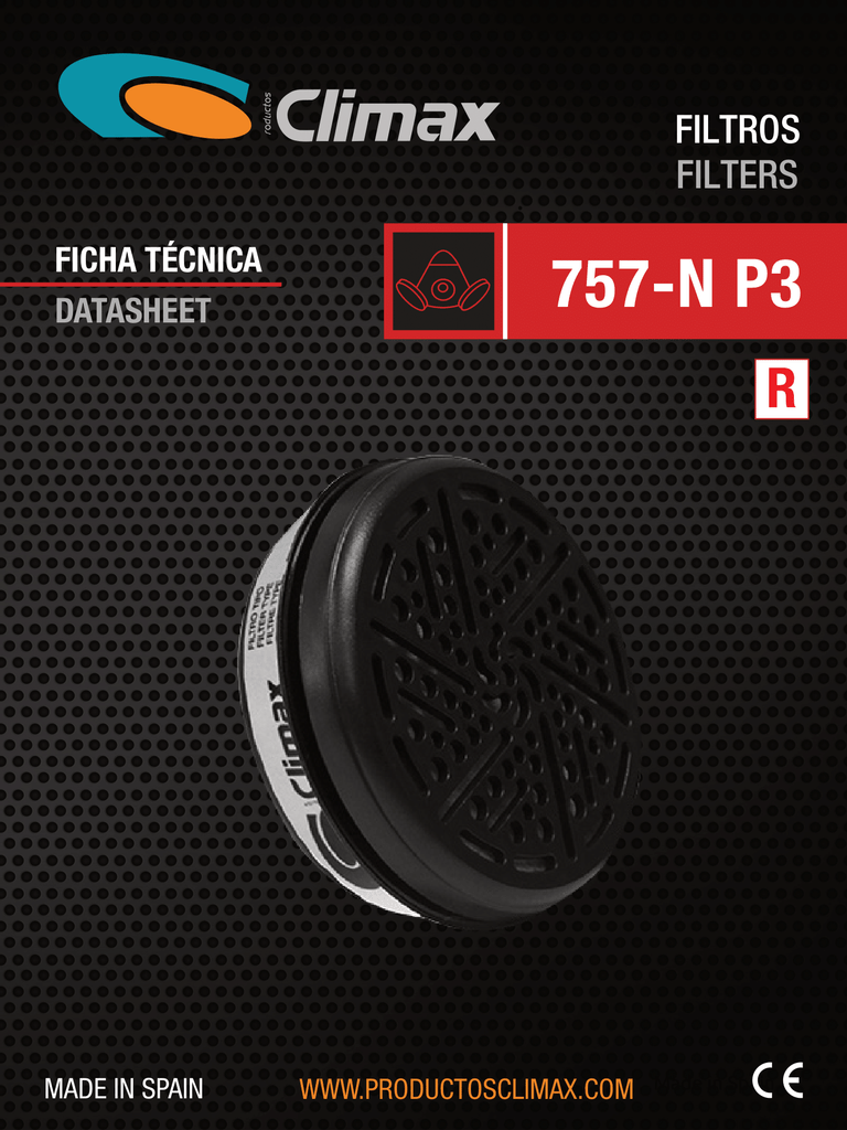 Los Filtros Climax tipo 757-N están diseñado para ser utilizado con la mascarilla Climax Mod. 757, Mod. 800 y la máscara 732-N.